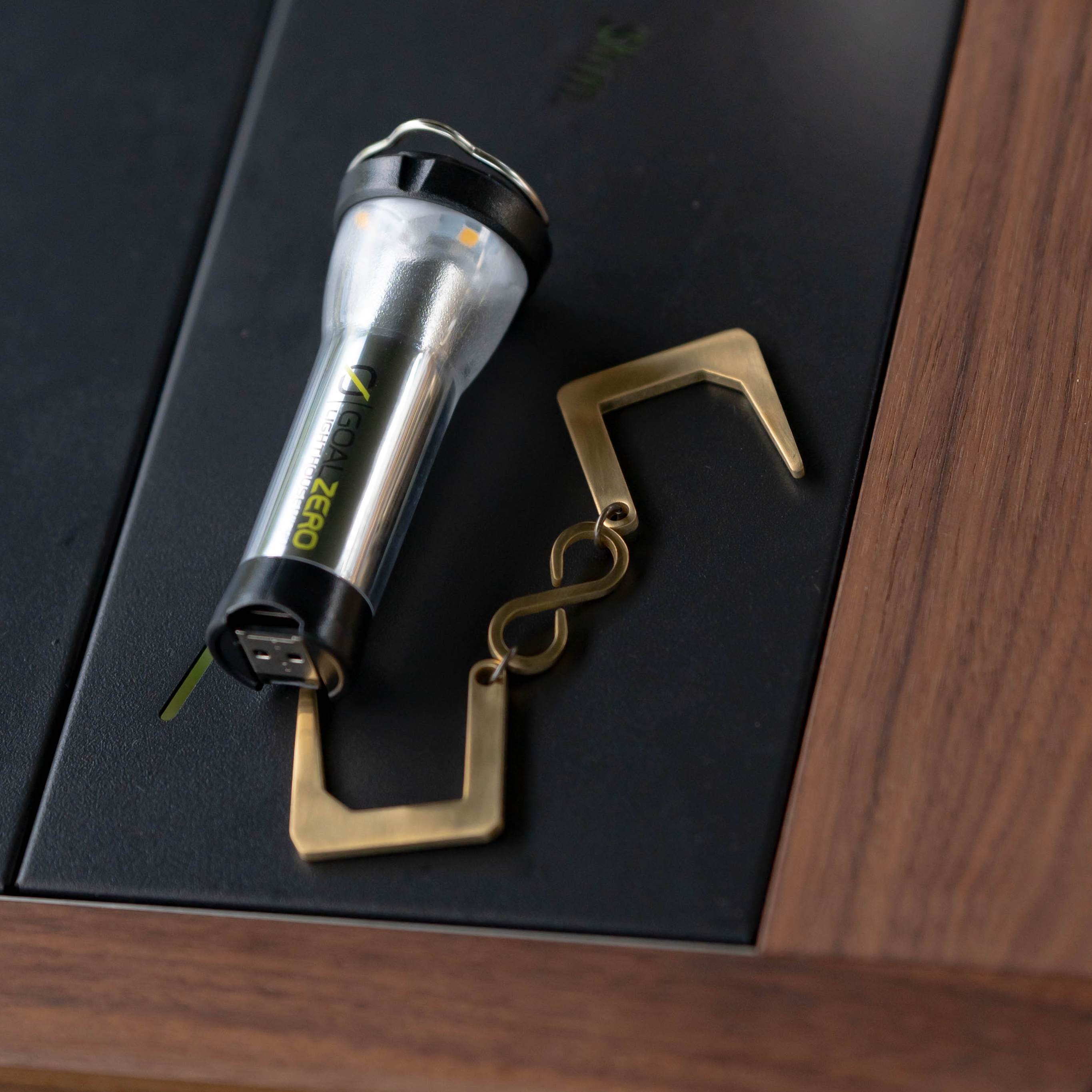 中央に「楽しみや可能性は無限大」という意味を込めたブランドロゴであるインフィニティーマークをあしらったアルミ製フック。一般的に普及する鉄製の無骨なフックとは一線を画す真鍮製の大人の色気の漂うフックです。